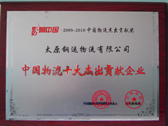 2010年6月24日,我公司在“第四屆中國(蘇州)國際物流與供應(yīng)鏈合作發(fā)展高峰論壇"暨"影響中國2009--2010中國物流杰出貢獻(xiàn)獎(jiǎng)"表彰活動(dòng),被授予“中國物流十大杰出貢獻(xiàn)企業(yè)”榮譽(yù)稱號。